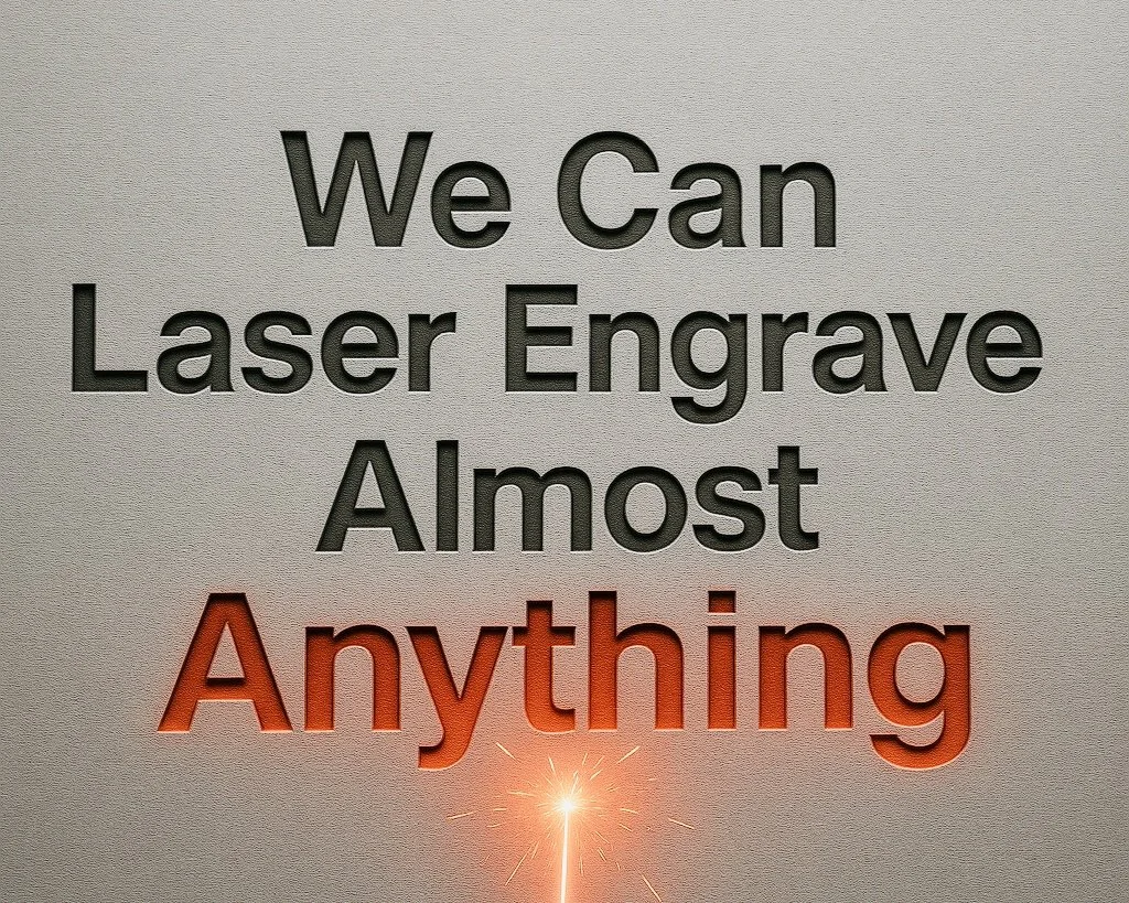 We can laser engrave almost anything! This includes metal, wood, glass, plastic, leather, and stone. We can engrave flat, round, or irregular shaped items. Check out our Laser Engraving Service page for more information on our capabilities.